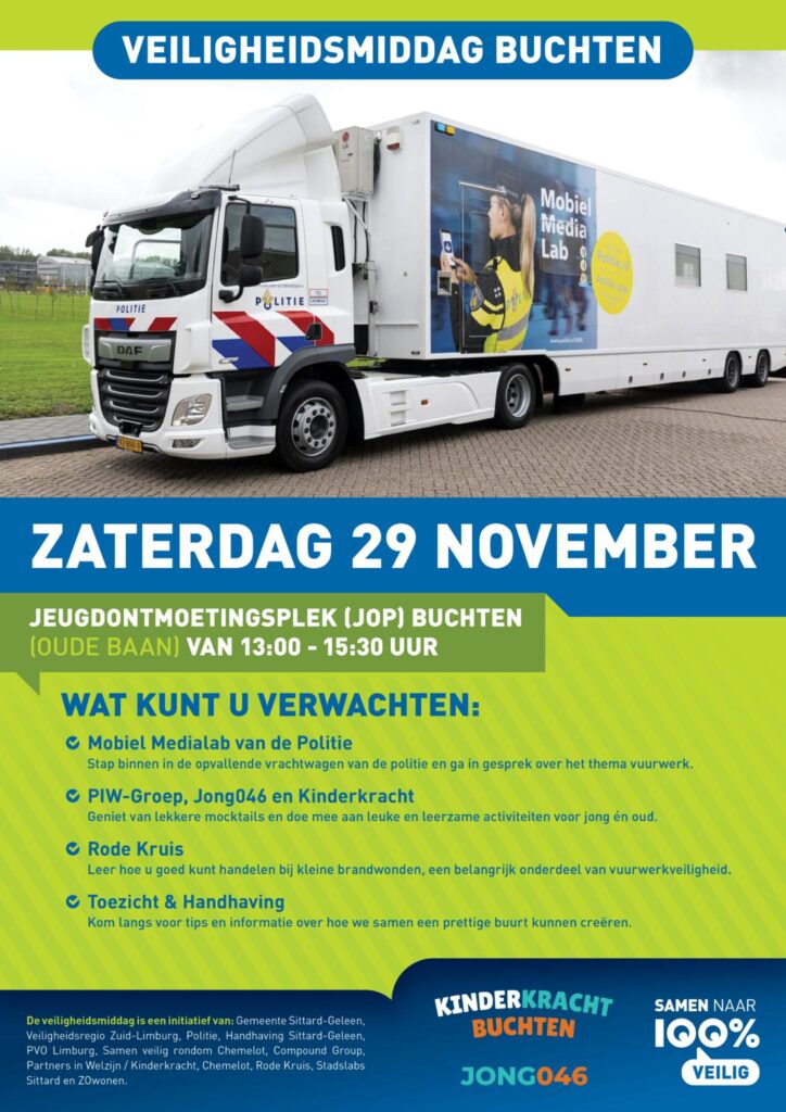 Op zaterdag 29 november organiseert Gemeente Sittard-Geleen samen met diverse partners een veiligheidsmiddag bij de Jongerenontmoetingsplek (JOP) Buchten in het Baanhoes, van 13:00 tot 15:30 uur.